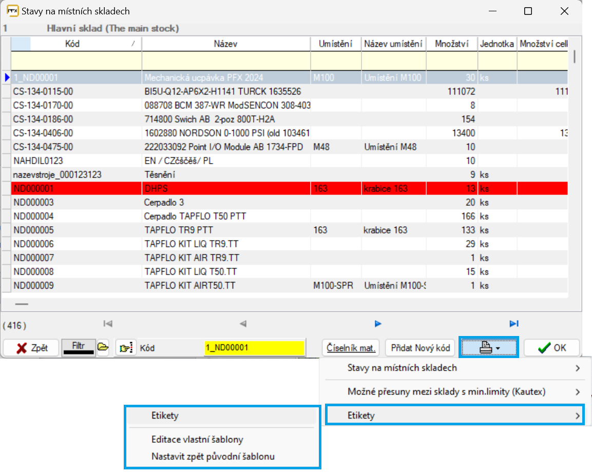 Novinku naleznete v menu Sklad -> Stavy na místních skladech -> následně si vyberete sklad, ze kterého chcete tisknout etikety: